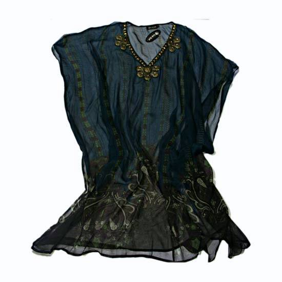 This blouse boasts an elegant style with the subtle printed patterns. The oversized sleeves along with the brass beads on the neck give a touch of uniqueness to it.