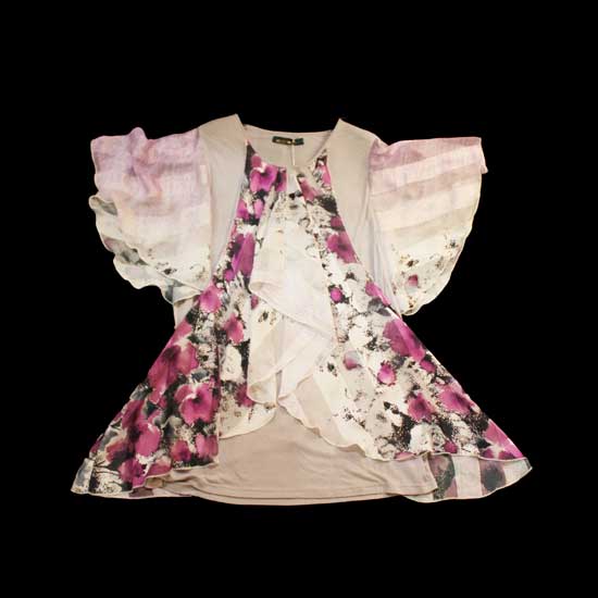 This is a ladies' blouse that is made of 90% cotton and 10% viscose. This unique blouse features short sleeves and a ruffled front and a classic round neckline. The multi-colored floral prints add extra elegance to the look of this blouse.