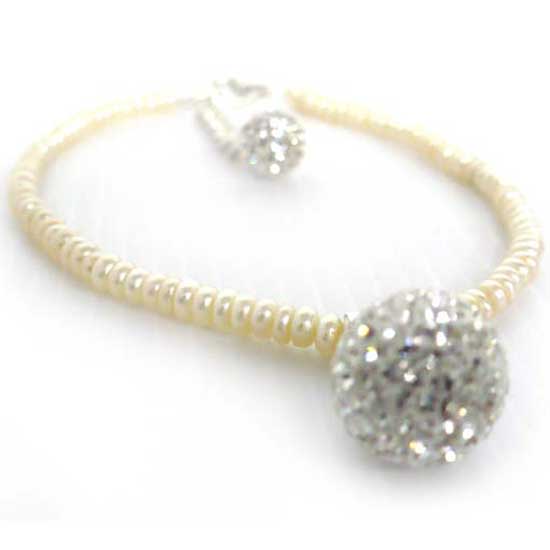This bracelet flaunts a simple yet elegant design to catch ladies’ attention. The bracelet features a lustrous pearl train and a silver ball. The ball is paved with shiny crystals to give out gorgeous sparkles.
