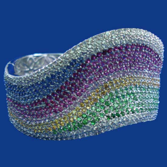 This featured bracelet employs delicious colors to delight hearts. The bracelet presents its beauty with the help of sapphires, rubies and other fancy gemstones of fascinating colors. The smooth and asymmetric design gives the bracelet a touch of modern beauty.