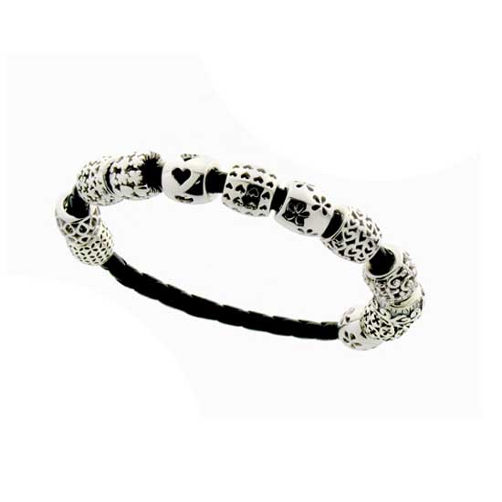 As shown is a ladies' bracelet coming with a black band trimmed with beads. The beads accentuate the whole piece with various delicate and charming cutouts. The bracelet will sure enrich your image with a chic yet elegant style.