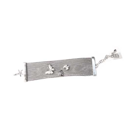 This trendy ladies' bracelet features a metal broad band in mesh construction. The bracelet is adorned vivid butterfly charms paved with diamonds. The alluring bracelet is a great gift choice for every lady.