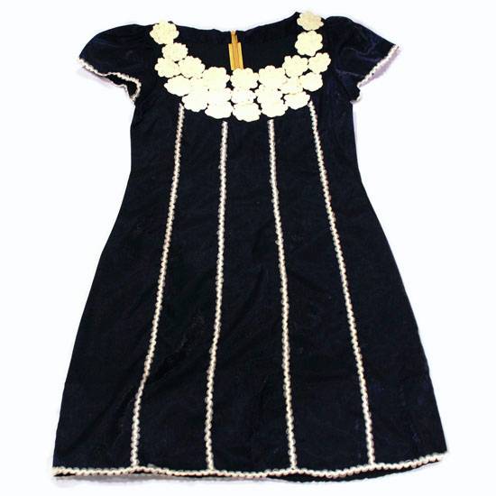 Shown here is a cap-sleeve dress featuring a cute and fashionable design. There are decorative flat flowers at the neck of the dress. This lovely dress is an ideal piece to update your closet.