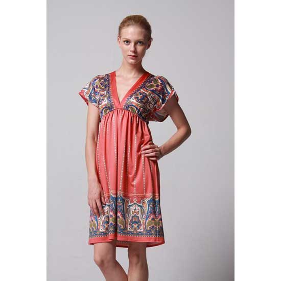 The ladies' dress features a V neckline and a pair of cap sleeves. It showcases filigree patterns on the sleeves and bottom for a decorative touch. This dress is made of soft fabric for comfortable wearing.