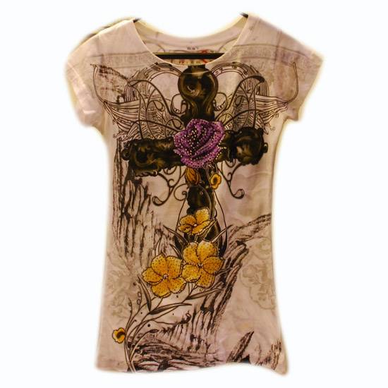 This ladies' T-shirt features a round-neck design and a pair of cap sleeves. It comes with printed floral patterns in the front and back. This T-shirt is suitable for young ladies.
