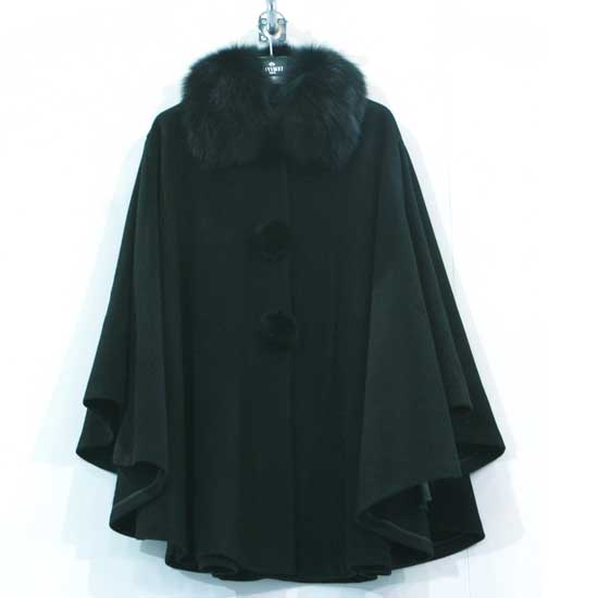 Showcased here is a black cape that comes in a simple yet stylish design. The collar is well embellished with fox fur for a sophisticated touch. The 100% cashmere construction ensures luxurious warmth.