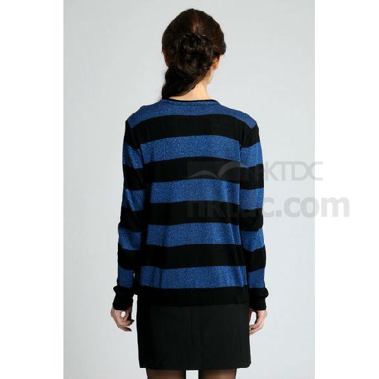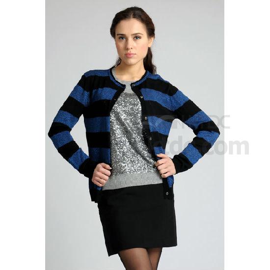 This ladies’ round-neck cardigan in blue & black color, with blue metallic yarn on blue strip, it is delicately made of 60% viscose, 40% cotton for a comfortable wearing experience. This beautiful cardigan updates your look instantly.