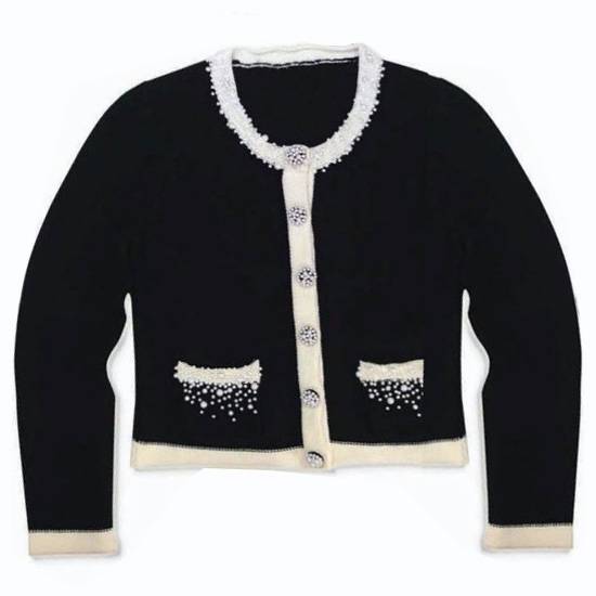 This ladies' cardigan boasts black and white colors. There are snowflake-like beads on the collar and pockets to make the design exquisite. The slim-fit style with a round-neck design shows off your elegance.