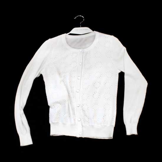 This is a ladies' cardigan that is made of 100% cotton for ultimate wearing comfort. It has a classic round collar, a single-breasted button front and long sleeves. The front is accented with woven laser cut patterns