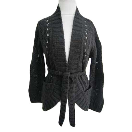 This ladies' cardigan in gray features a ribbed design from the neck till the rounded hem. It is attached with a ribbed belt for an extra touch. This long-sleeved cardigan is completed with two pockets.