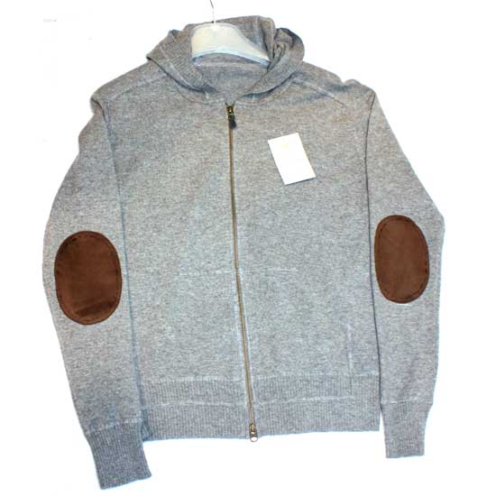 Showcased is a ladies' jacket made of cashmere in a gray color. It is characterized by the elbow patches. This ladies' cashmere jacket is stylish and comfortable to wear.
