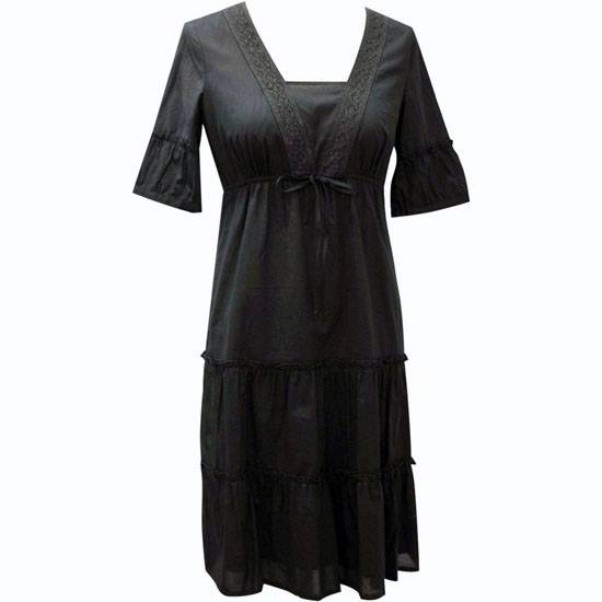 This knee-length dress comes with a pair of mid-sleeves and an empire waist. The V-neck is decorated with beautiful black lace to showcase a feminine detail. This simple yet stylish dress is an ideal piece of casual wear for ladies in summer.