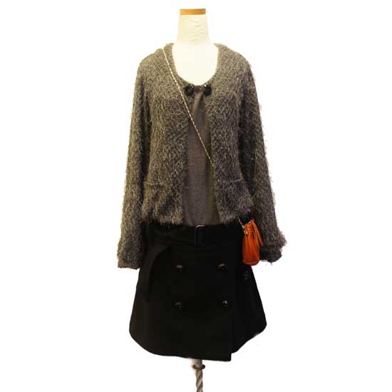 This ladies' casual wear set features a feathery cardigan in gray, a matching top and a belted skirt. Button detail on the cardigan echoes that on the skirt. This charming, delightful set is an ideal choice for fall and winter.