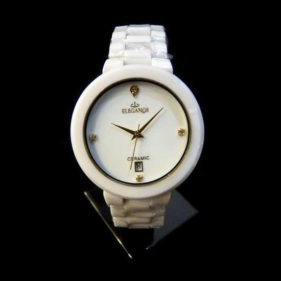 This is a ladies' watch featuring an all-white ceramic case and bracelet for a chic look. The white dial is equipped with bronze-toned hands and adorned with four shimmering stones as timer markers. The beautiful ceramic watch is well-protected by a water-resistance level of up to 30 meters, ensuring enduring reliability.