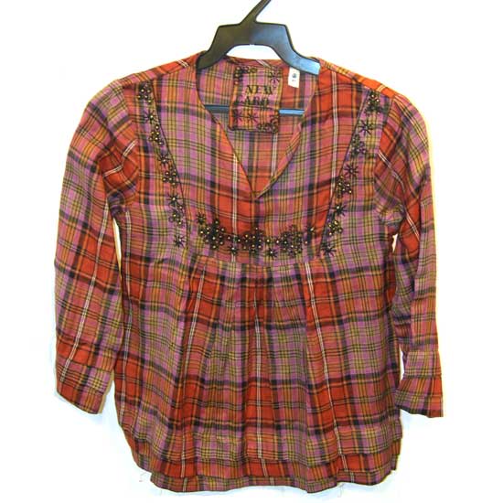 Featured is a ladies' 3/4-sleeve blouse that comes with a V-neck. The blouse is embellished with delicate checked patterns in appealing colors. The neckline features dainty embroidery and beads, raising the uniqueness of this blouse.