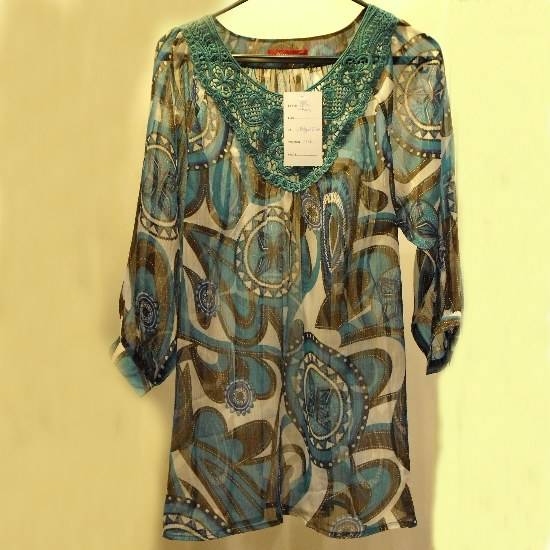 This stylish chiffon blouse features embroidered accents on the V-neckline. The half-length loose-fit sleeves showcase a touch of uniqueness. It has all-over abstract geometrical patterns. Complete your summer wardrobe with this fun and flirty blouse.