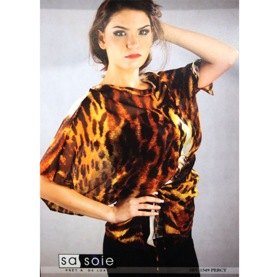 Pictured is a ladies’ blouse made of high quality silk chiffon material. The special dolman sleeves and the overall leopard motif make this piece a best choice for the fashionable ladies. The top-quality construction allows comfortable wearing.