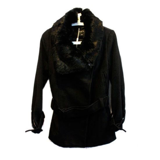This is a ladies' coat made of 60% polyester and 30% wool. Featuring a wool-blend wide collar, this coat looks attractive in a classic style with a self-tie belt. This stylish coat will provide extra warmth and comfort when necessary.