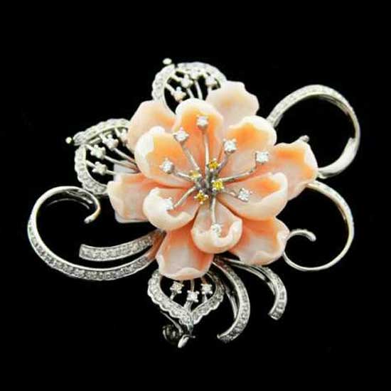 This ladies’ coral brooch boasts a blossoming flower with delicate curved petals. The stamens set with glittery stones at the center lend extra glamor. This exquisite brooch is sure to glam up your chest.