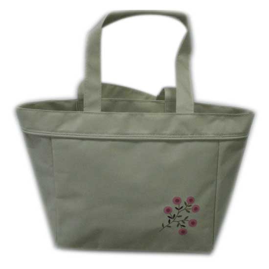 This cosmetic bag flaunts a simple printed flower decoration at the bottom corner. It features a trapezium shape for added style. The two sturdy handles ensure reliable performance. This bag makes an ideal ladies' fashion accessory.