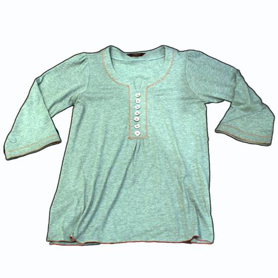 Shown here is a ladies' blouse with a retro neck and three-quarter sleeves. The chest of the blouse is embellished with seven shiny buttons. This is the perfect item to match with a range of outfits.