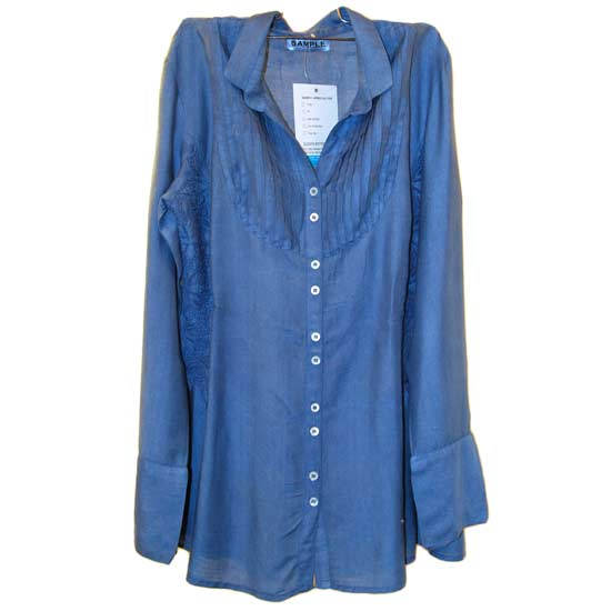 This outstanding blouse boasts a pair of long sleeves and a button-up front. It features a ruffled front with hand-embroidered floral patterns on the sides. This comfortable blouse is great for your casual wardrobe.