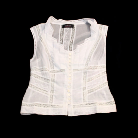 This ladies’ cotton blouse features a sleeveless and translucent design for added cool. The intriguing lace details add a feminine touch easily. This fashionable blouse in white is ideal for summer wear.