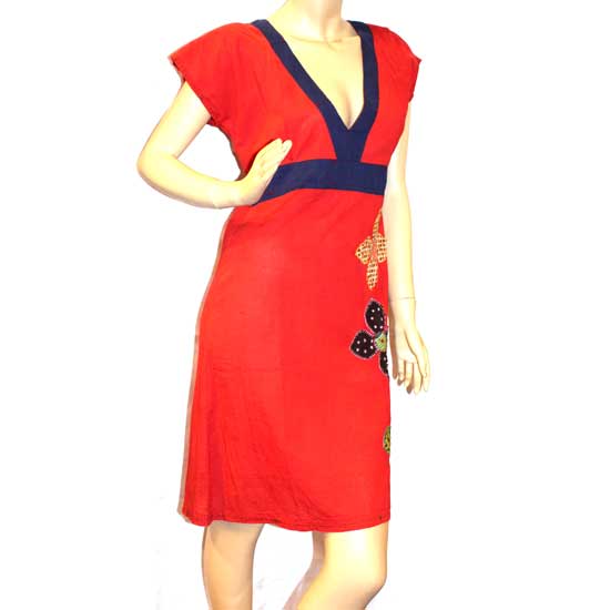 Highlighted is a ladies' cotton dress featuring a deep V-neck for an impressive style. The hand-embroidered blossoms at the bottom exhibit a graceful design. This comfortable dress simply adds a gracious touch to a lady.