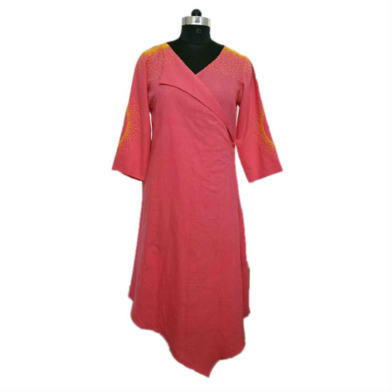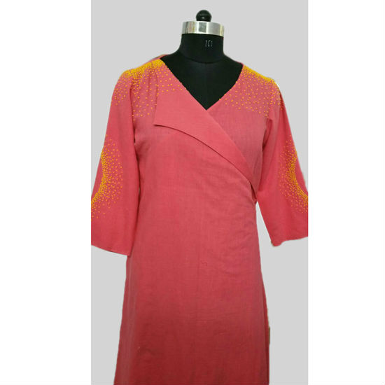 Casual pink dress which has a one side collar. The dress length is bleow knee and the bottom has uneven edging. The sleeves and the shoulders have French-knot embroidery on them with a sprinkle-like effect. This dress can be made in any size and in available colours.