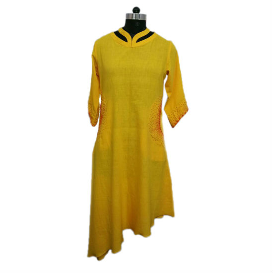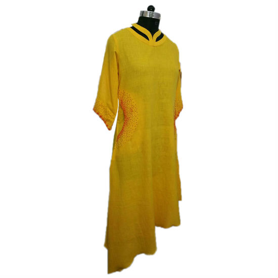 Cotton yellow dress with round neck and keyhole on a Chinese collar. The dress has two side round pockets on which there is French-knot hand embroidery. The cuffs of the sleeves are also embroidered. The bottom of the dress has a diagonal cut such that it is short from one side and longer from the other. This 100% cotton dress can be made in any size and available colours.