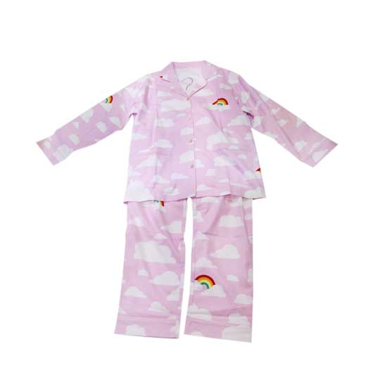 This pair of pajamas for ladies features rainbow and white cloud patterns on the pink background. It is made of 100% cotton flannel for maximum comfort. There are various styles available for your selection.