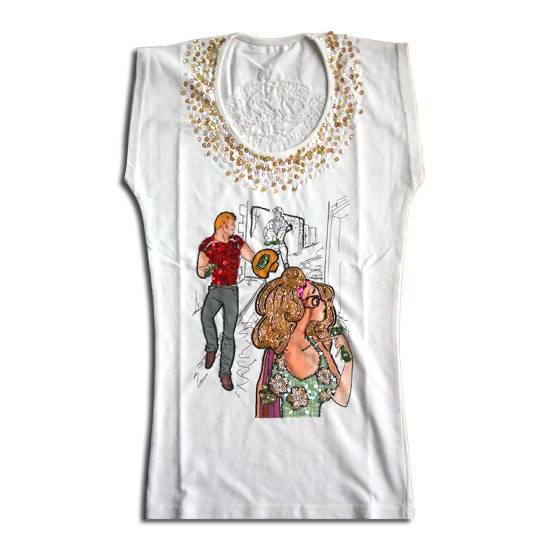• This printing tee shirt has hand embroidery with sequins and beads.