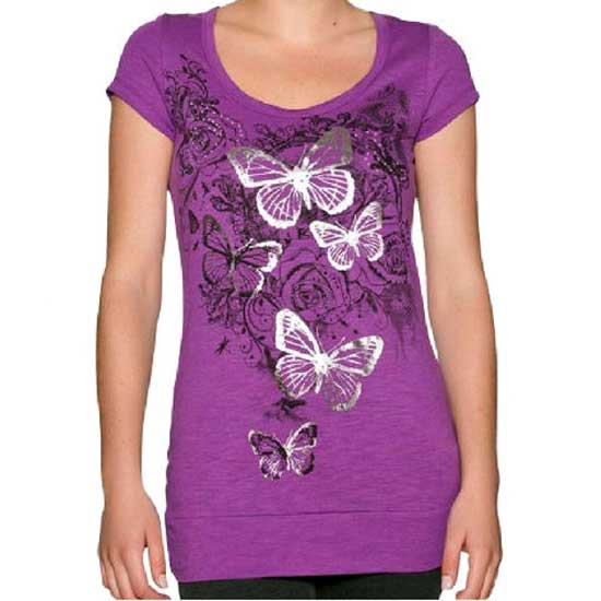 This ladies’ purple cotton T-shirt is characterized by its silvery and black butterfly foil print, evoking a sense of vogue. It comes with a scoop neck and cap sleeves. This fashionable tee is finished with a banded hem for added style.