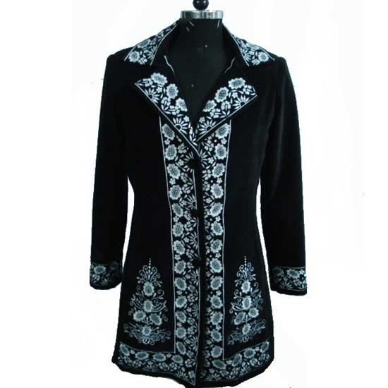 The ladies' coat is made of 100% cotton velvet to give a warm and comfortable texture. The floral embroidery on the neckline, sleeves and down form the collar adds a decorative touch. This coat is a great item to keep you warm in cold winter.