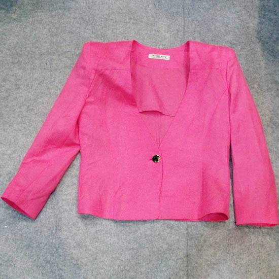 This eye-catching jacket comes in striking fuchsia color. It has a deep V-neck and a single-button front. It features shoulder pads for a touch of retro styling. The 3/4-length sleeves match perfectly with the cropped-length jacket. Stand out in this sophisticated jacket.
