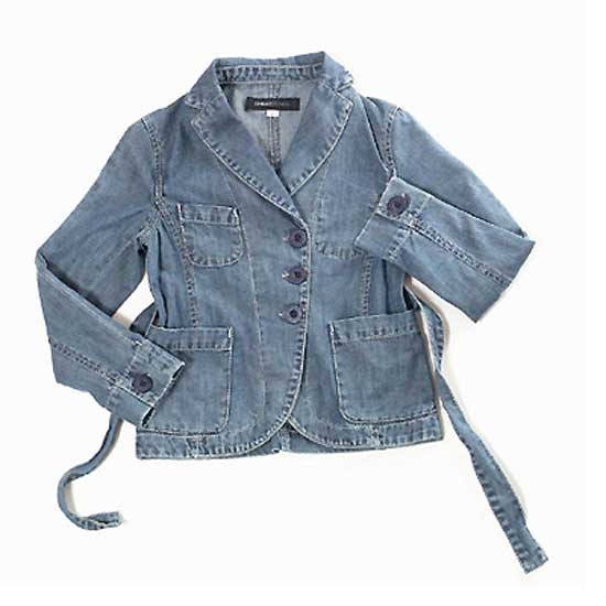 Displayed is a ladies' denim blazer with an enzyme stone-wash finish to create heavy abrasion. The short-body cutting makes this piece ideal to exude female silhouettes. This ladies' denim blazer matches casual jeans and skirts easily.