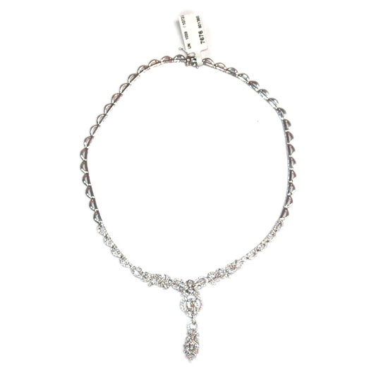 Pictured is an alluring diamond necklace that sparkles with irresistible beauty. The 18K-gold construction promises enduring brilliance. This captivating necklace attached with dangling pendant makes a noble choice for the marquise and princess.