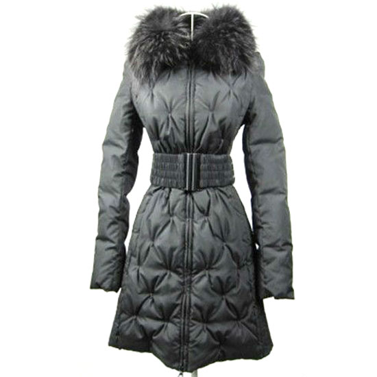 This is a ladies' down coat in allover black with a real raccoon fur collar. It is finely filled with duck feathers inside for enhanced softness. This long coat is a great choice for keeping yourself warm on cold days.