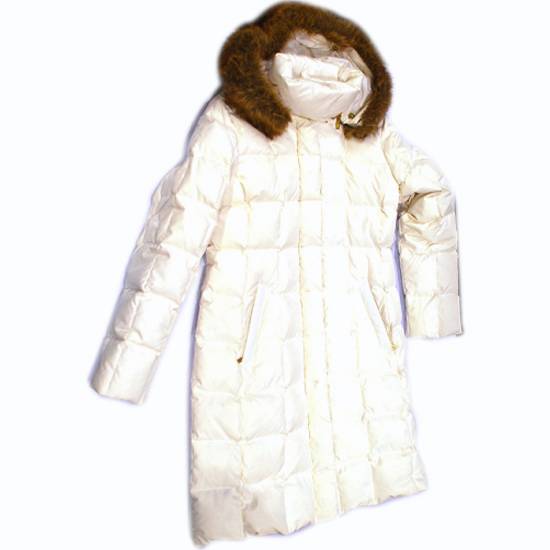 The ladies' down jacket features a fur trim hood and a stand-up collar for added warmth. It comes with a concealed zipper closure and pockets. Stay warm with this long down fill jacket.