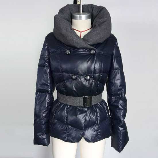 This is a ladies' down jacket with a fashionable and sophisticated design. It features a warm collar and a double-breasted front closure with matching buttons. The elastic waist belt is designed to showcase your alluring waistline perfectly.