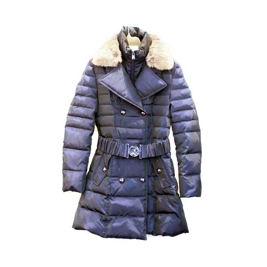 This is a ladies' jacket that comes in a long length. With a decorative belt, this down jacket is fashionable and stylish. A wide furry collar in a straw color adds a touch of contrast to this garment.