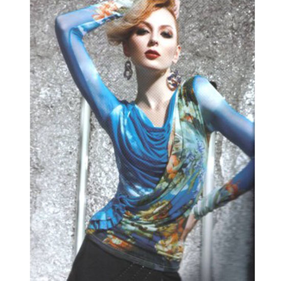 This fine ladies' blouse is designed with an elegant draped-neck front with matching draping detail. Print patterns in the theme of ocean add femininity to this blouse. This comfortable blouse is a casual choice for fall and winter.