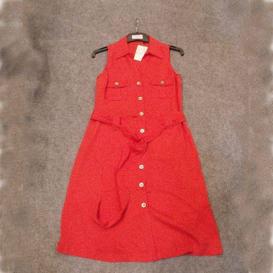 This stylish sleeveless dress has a button front closure. It features a V-neck and notched collar. It is slightly flared from the waist to hem. This dress has the look of a trench coat for a fun fashion twist.