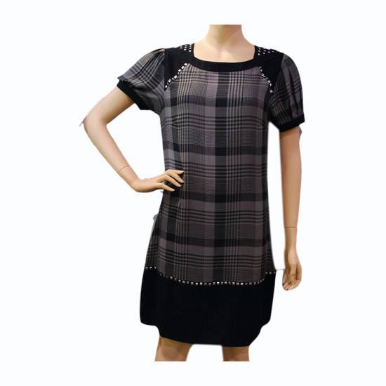 The ladies' dress comes in short-sleeve design. The all-over grid patterns and metal studs bring out a chic style while the viscose fabric offers a smooth and comfortable touch. This elegant ladies' dress is easy to wear and provides a flattering fit.