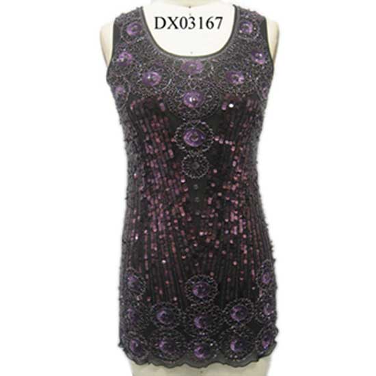 Displayed is a handmade ladies' dress with round-shaped embroideries. The dress is also richly trimmed up with glittery beads. With sleeveless and thigh-length design, this piece is ideal for summer days.