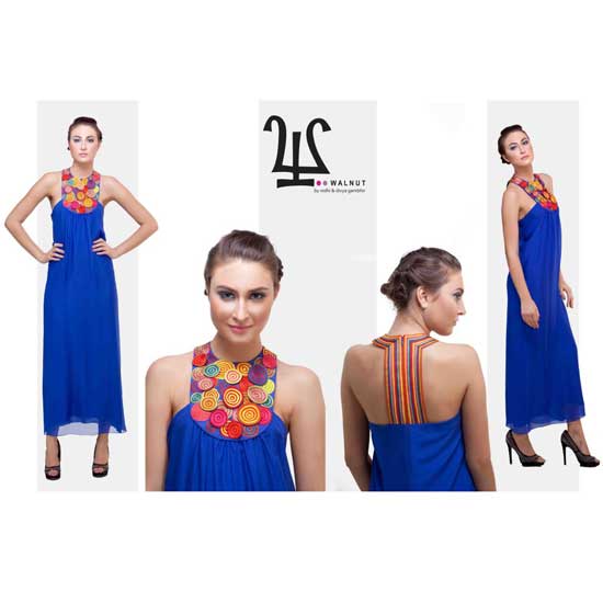 This unique ladies' dress spotlights a colorful halter neck with a dark blue bottom. It is finely embellished with ruffle details on the front. The graceful ankle-length dress is suitable for wearing at all kinds of parties and balls.