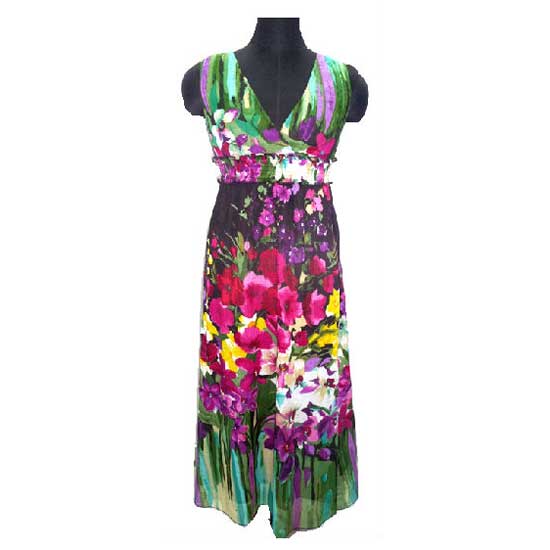 This gorgeous ladies’ dress features an overlapping bodice and a raised waistline for added style. Brilliant colored floral patterns offer a vivid picture of blossoming. This enchanting dress makes you a charming lady in an instant.