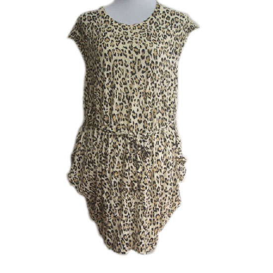 Displayed here is a ladies’ dress with a scoop neck and cap sleeves. The gorgeous knitted dress features an allover leopard print to convey a chic touch. The ruched skirt is finished with an asymmetrical hem for added style.