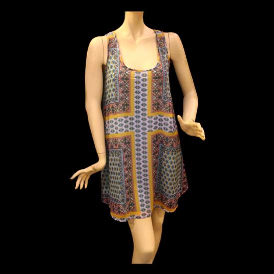 Made of silky smooth georgette fabric, this fashionable ladies' dress is printed with exotic geometric motifs. The thigh-length dress features a scoop neck and a sleeveless design. The lightweight and breathable dress is extremely comfortable to wear.