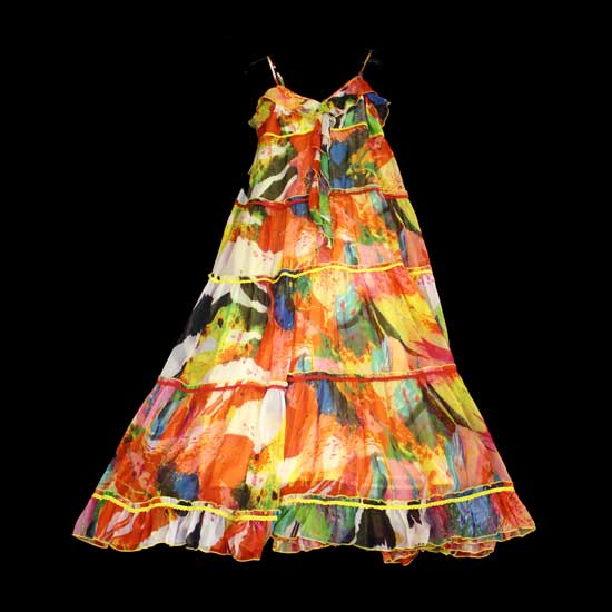 This ladies' long dress is accented with brilliant multi-color prints. The classy dress features slim shoulder straps and a sweetheart neckline. Made of 100% chiffon fabric, the dress boasts floaty and lightweight construction.
